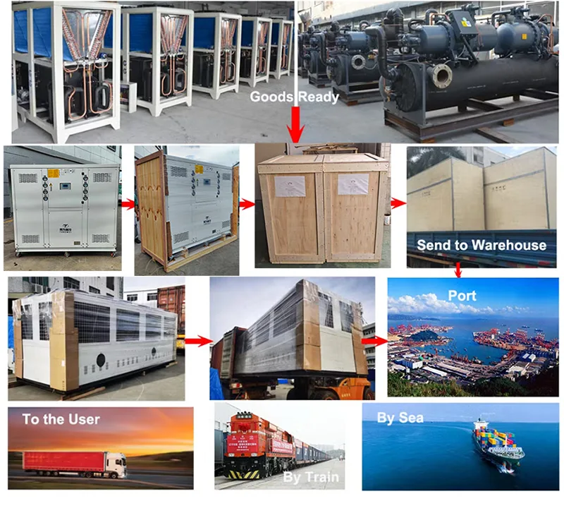 Som en professionell leverantör av vattenkylare och exportör har vi vår egen speditör för att ordna transporten. Vår kylmaskin är med plywoodförpackning, som förhindrar skador under transport och uppfyller exportstandarder. Det finns tre sätt att leverera din kylenhet: