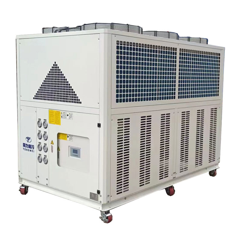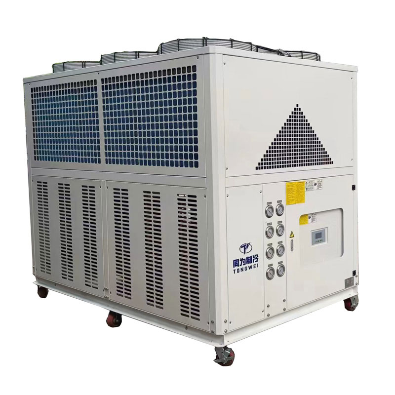 Thermoforming Chillers designed and manufactured by Tongwei is made of scroll/screw compressor, air/water-cooled condenser, stainless steel coil in water tank evaporator (shell and tube for option, power reverse phase, microprocessor, water pump, and protecting devices, etc.We can provide 1HP to 200HP industrial chillers for thermoforming machine on air cooled and water cooled as your request, they are easily to install and use, our Chillers har ett brett utbud av kyltemperaturer från 5 ℃ till 25 ℃.