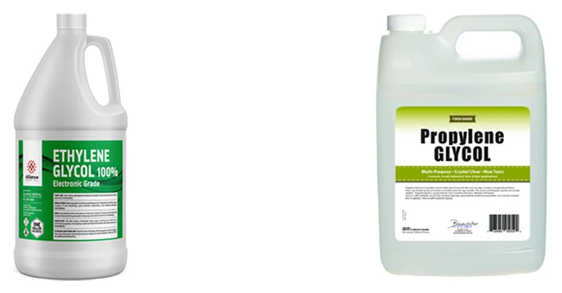 Den mest använda kylvätskan i en kylare är vatten eller en blandning av vatten-glykol. Glykolbaserade kylmedel består av antingen etylenglykol eller propylenglykol. Den största fördelen med glykolkylmedel är deras anti-frysegenskaper. Ren vatten fryser vid 0 grader C, medan 30% etylenglykol fryser vid -14 grader C. Den låga fryspunkten för glykolblandningar gör dem idealiska för kylningsföremål som ligger under fryspunkten för vatten. Även om glykol har en lägre värmekapacitet än vatten (varje kilogram glykol är lättare att värma än ett kilo vatten), tillåter den höga temperaturskillnaden glykolblandningen att sprida värme snabbare än rent vatten. Glykolblandningarna är mer lämpliga för applikationer där kylaren snabbt måste sprida ett stort antal värme. Förutom att tillhandahålla utmärkta värmeöverföringsparametrar tenderar glykol att avskräcka alger tillväxt i värmeöverföringsutrustning.