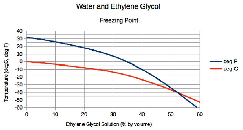 It is important to use the proper ratio of glycol to water mixture in the cooling system depends on the coldest temperature you need during operation, as insufficient glycol can cause the system to freeze, possibly bursting pipes and even destroying the chiller evaporator even may damage the glycol chiller, while too much glycol to a chiller system will result in an inefficient system.But what’s the best ratio for glycol and Vattenblandningar? Se nedan glykolförhållandet mellan glykol och vattenblandningar för glykolkylaren i din kylprocess: