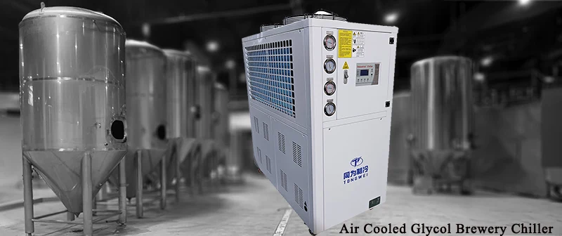 Luftkylda glykolbryggeri kylare använder aluminiumfen+fläkt som kondensatorer som liknar "radiatorer" i en bil. De använder en fläkt för att tvinga luft genom kylmedelsspolen. Såvida de inte är specifikt utformade för höga omgivningsförhållanden, måste luftkylda kondensatorer fungera effektivt vid en omgivningstemperatur på 45 ℃ eller mindre.