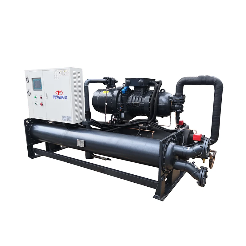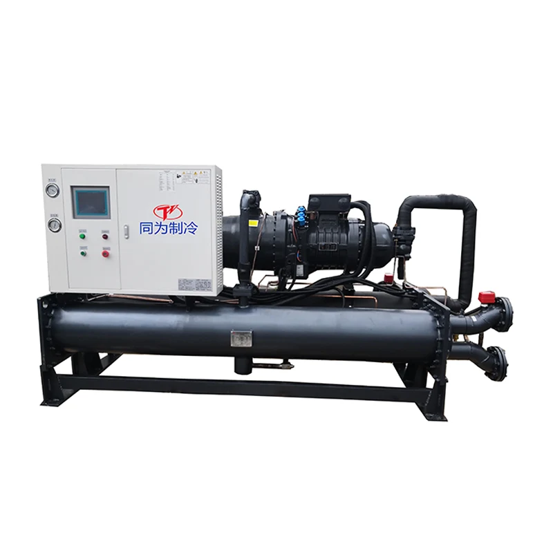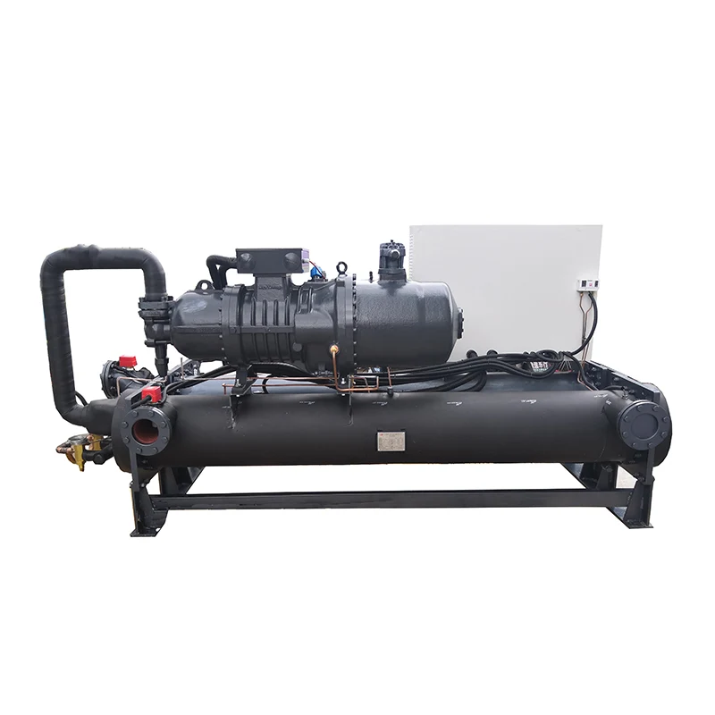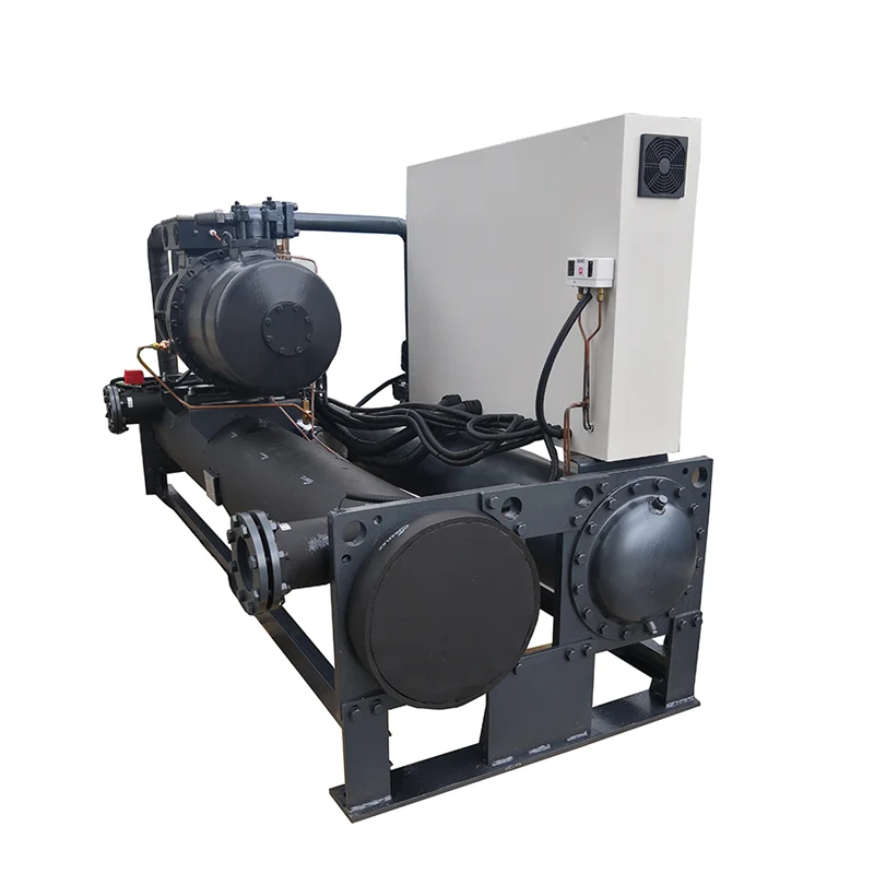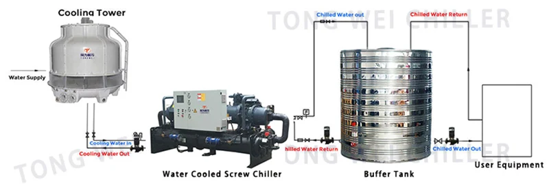 Vattenkyld skruvmat och beveage-bearbetning kylare med en skal- och rörvatten-typkondensor som är fäst vid ett kyltorn och används vanligtvis i medelstora och breda installationer där vatten är tillgängligt. Så vattenkylt vattenkylare behöver anslutas till vattenkyltornet och vattenkylpumpen utanför, installationen är mer besvär än luftkylkylare.