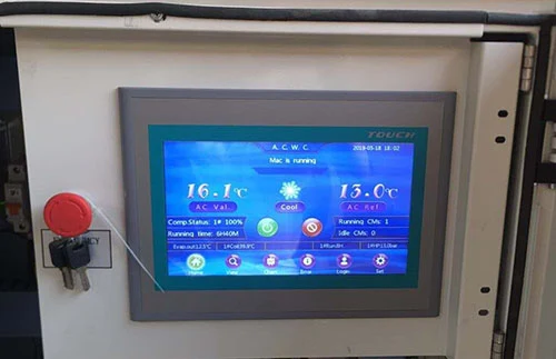 »PLC -temperaturkontroller för att övervaka enhetens övergripande drift. Dess pekskärm möjliggör justeringar och inställningar. Spara energiförbrukning genom att reglera kylmedelsens temperatur och tryck som kommer in i kompressorn.